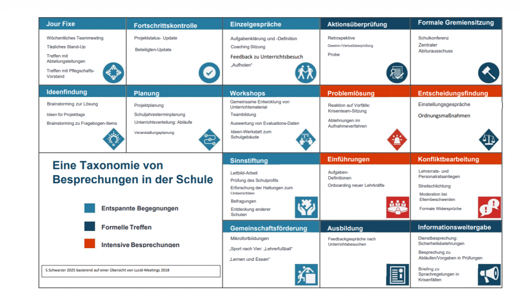 Eine Taxonomie der schulischen Besprechungen hilft, die Methoden der Durchführung und die Steuerung der eigenen Aufmerksamkeit im Verlauf der Besprechung entsprechend anzupassen. Dies ist in „entspannten Begegnungen“, „formellen Treffen“ und „intensiven Besprechungen“ jeweils in unterschiedlichem Maße gefordert.